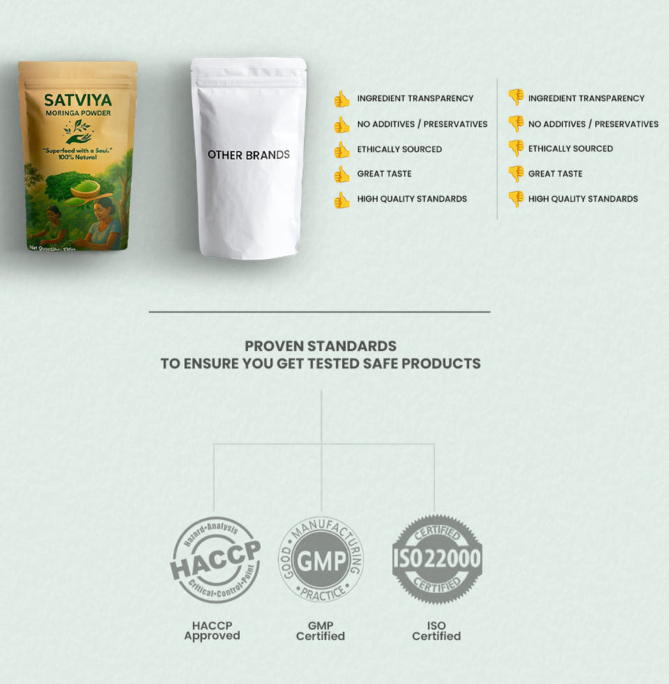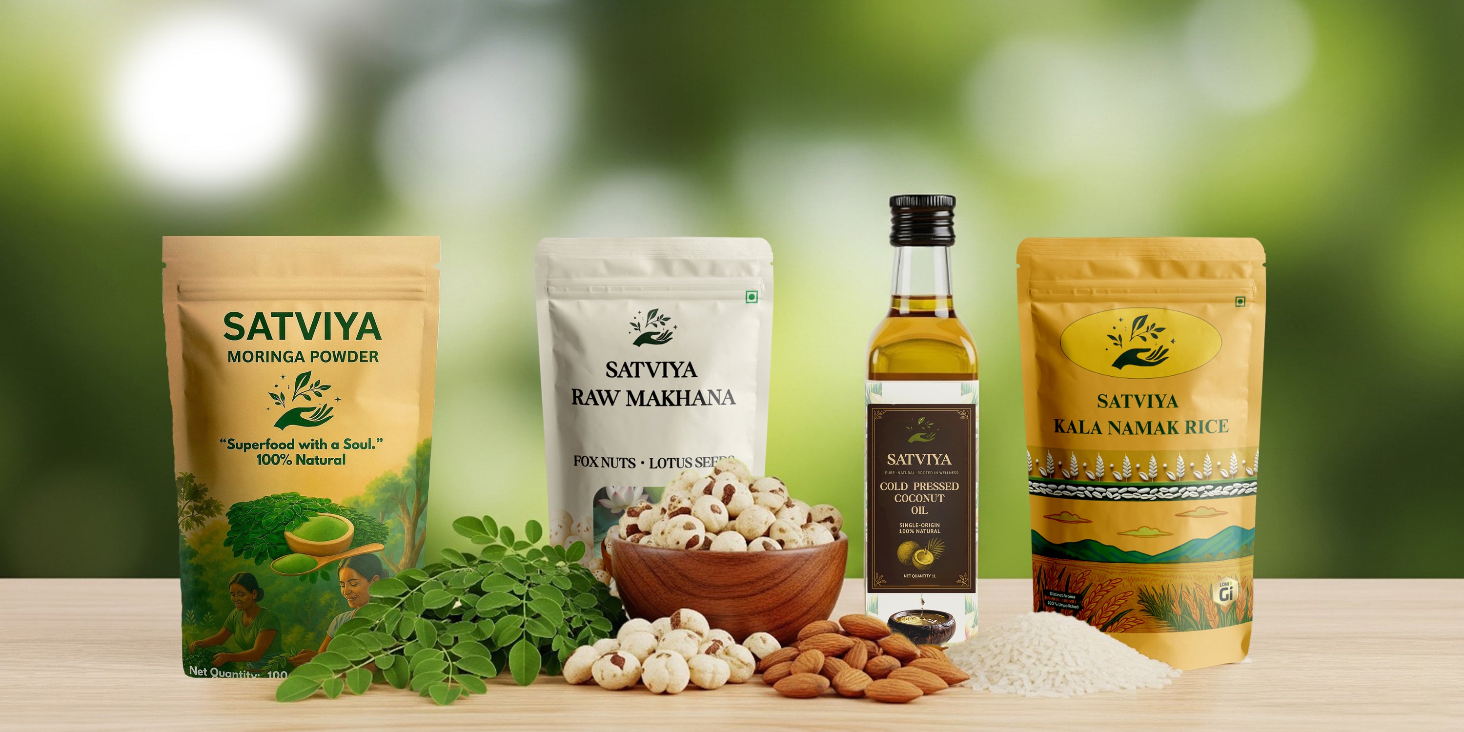 At Vooshreja Foods and Cafe, we bring you Satviya – a promise of wellness rooted in purity, sustainability, and authenticity. From nutrient-rich Moringa powders and low-GI Kala Namak rice, to cold-pressed oils, California almonds, and guilt-free festive snacks, every product is a step toward healthier living.